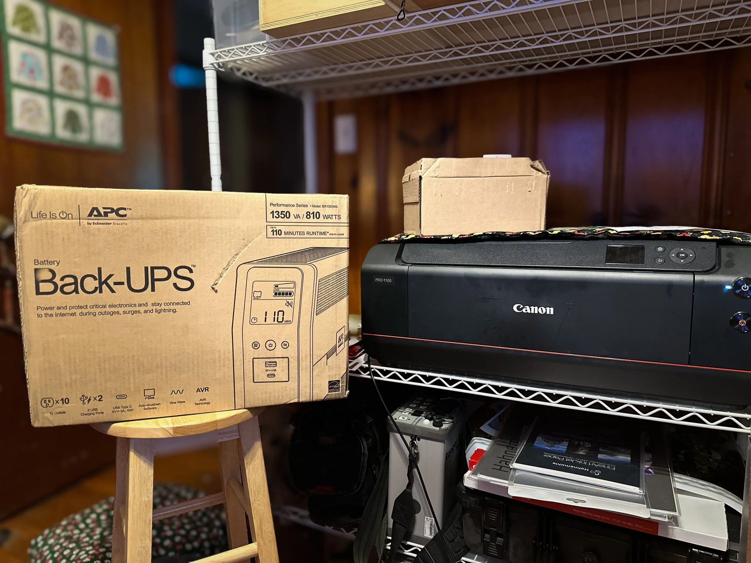 I ended up going back to B&H to order the other 11 inks and a maintenance cartridge. I also started looking into battery backup units from APC and CyberPower to avoid future problems. With so many choices, I chose the APC 1350VA battery backup for our printer. It's an 810-watt unit, which may be more than I need, but I thought it was better to have extra power. Since the last outage on June 23, I discovered from the Canon forums that when this printer is in standby mode, it draws 1.1 watts of power. I feel prepared for whatever comes next.